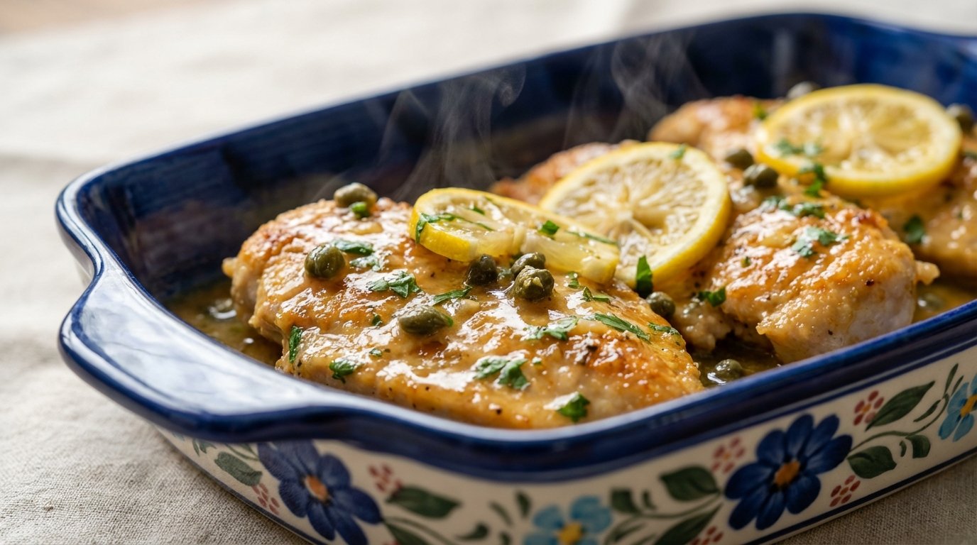 Piccata succeeds when the sauce is bright but rounded, not harshly acidic. Reducing the wine properly before adding stock prevents the sauce from tasting thin. The flour on the chicken does two jobs: it helps browning and gives the sauce a subtle natural thickening. Swirling in cold butter at the end creates the classic silky texture—adding it too early can cause the sauce to break. Capers should be added toward the end so they stay firm and briny rather than mushy. If your lemons are very sharp, a pinch of sugar (literally a pinch) can balance the sauce without making it sweet. Serving the chicken immediately keeps the cutlets tender and prevents the sauce from over‑reducing.